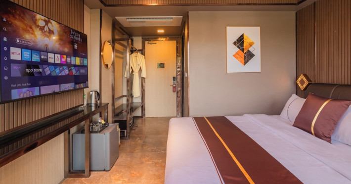 Room features air conditioning, balcony/terrace, bathrobe, cable/satellite TV, cleaning/housekeeping, coffee/tea maker, desk, hairdryer, mini bar/fridge, non-smoking rooms, private bathroom, safe box, shower, telephone, toiletries provided, towels provided, and Wi-Fi access.