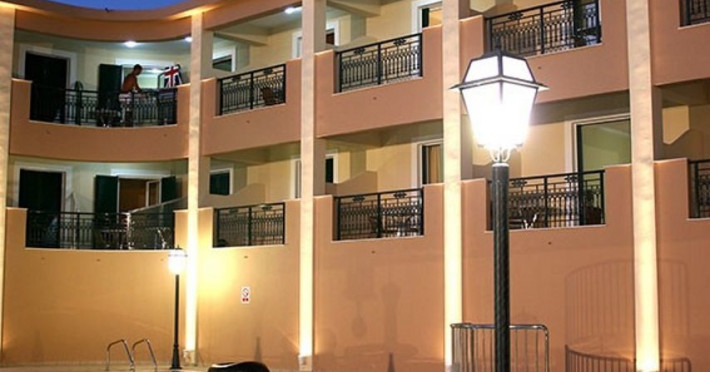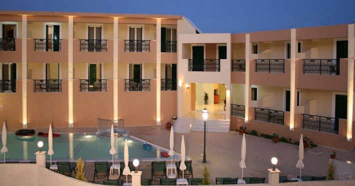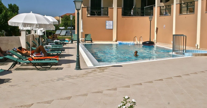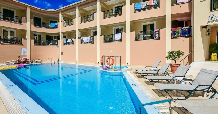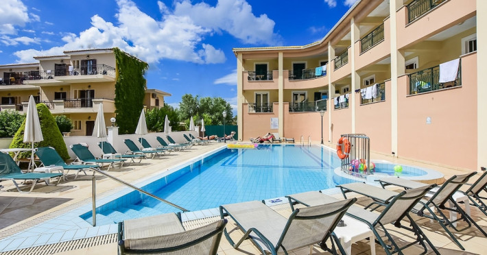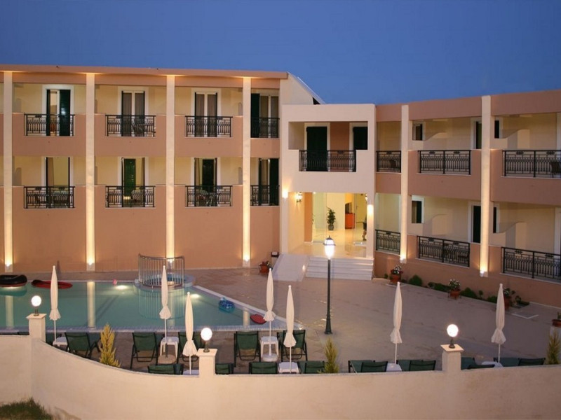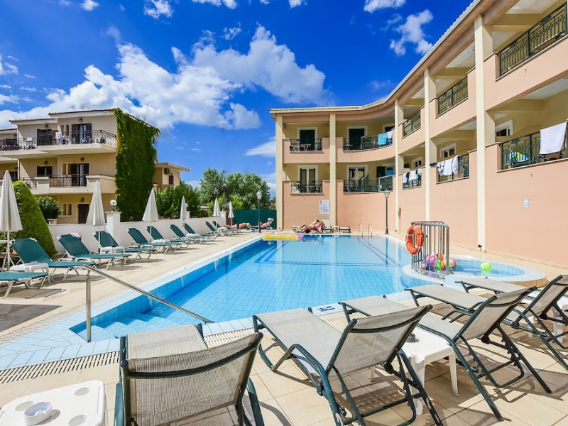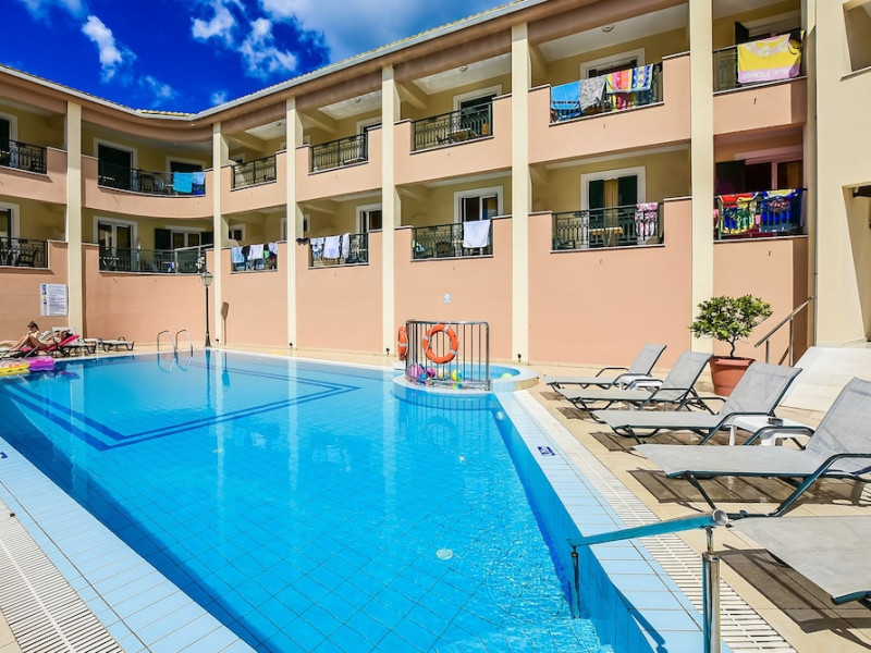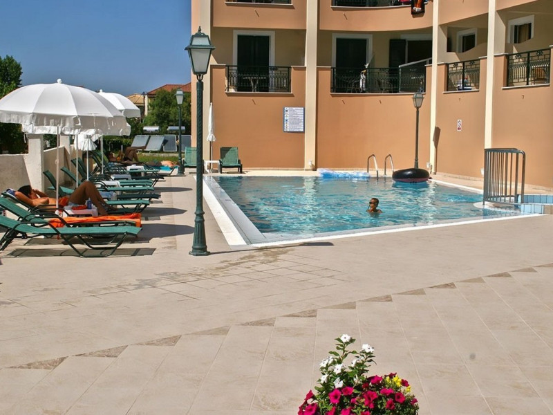 Facilities and services include bar, swimming pool, wireless Internet access at public areas, parking and 24 hour reception. Apartments feature kitchenette, fridge, kettle, TV, telephone, air conditioning (extra charge), safe (extra charge), bathroom and balcony / terrace. Please note that some of the above facilities may be closed due to weather / seasonal conditions.Address: Laganas, 29100 Zakynthos, Greece.