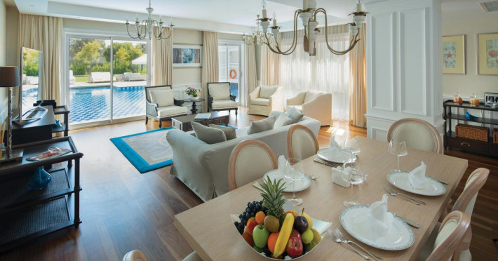 Complexul are restaurant tip bufet, cu bufet pentru copii, și 4 restaurante à la carte care servesc mâncăruri selectate turce și italiene și specialități din fructe de mare. De asemenea, complexul are mai multe baruri.