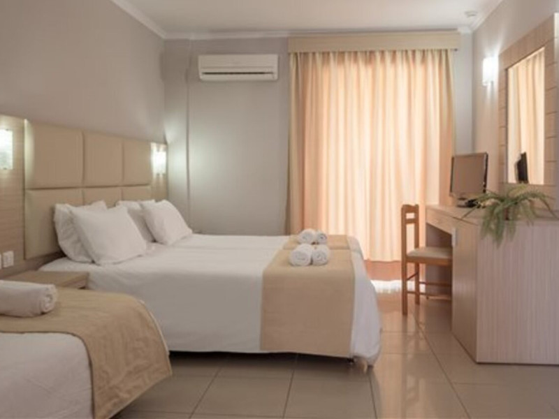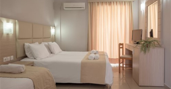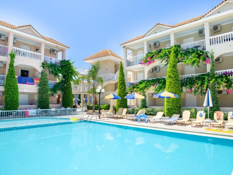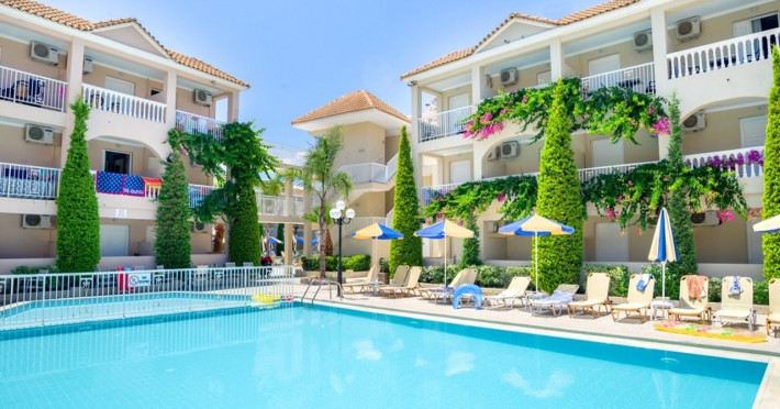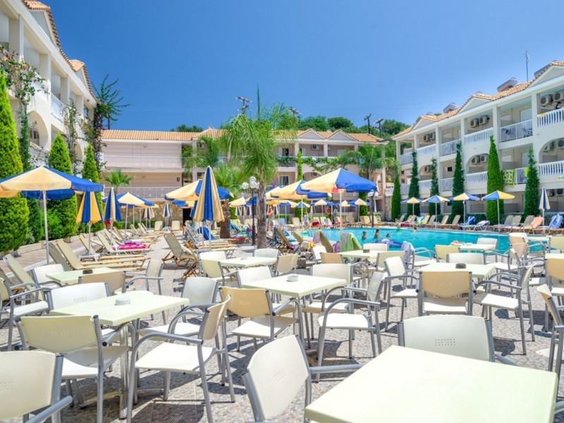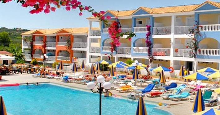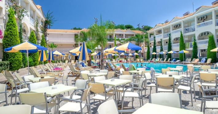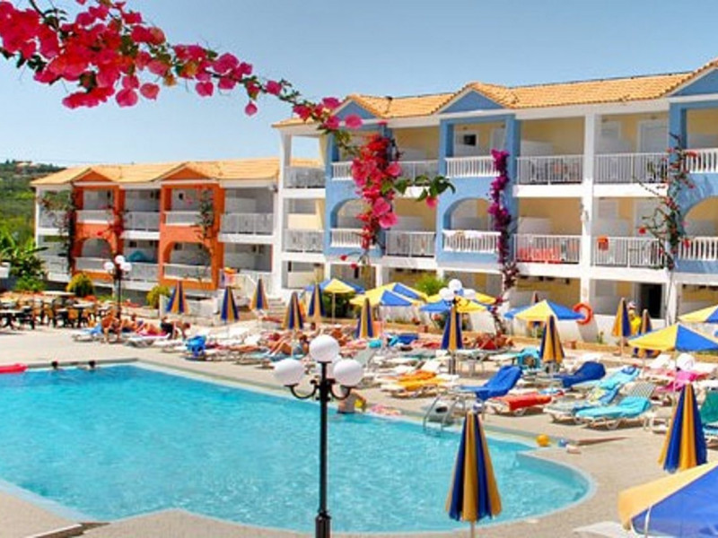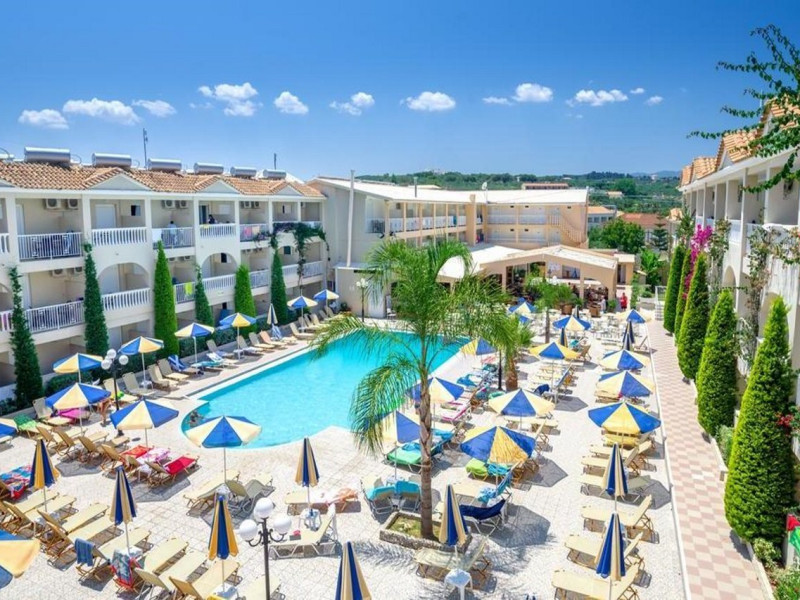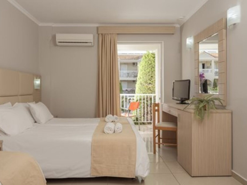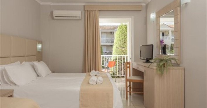 Facilities and services include restaurant, bar, swimming pools, children's pool, playground, table tennis, wireless Internet, elevator, and 24 hour reception. Studios and family rooms feature mini fridge, air conditioning, safe, TV, telephone, wireless Internet access, bathroom, hairdryer and balcony / terrace. The All Inclusive-concept includes all meals (breakfast, lunch, dinner and snacks) and drinks such as soft drinks, beer, wine, water and alcoholic drinks, all of local brands. Drinks are served from 10.00 am until 24:00 hrs. Please note that some of the above facilities may be closed due to weather / seasonal conditions.Address: Tsilivi, 29100 Zakynthos, Greece.