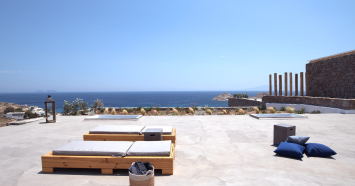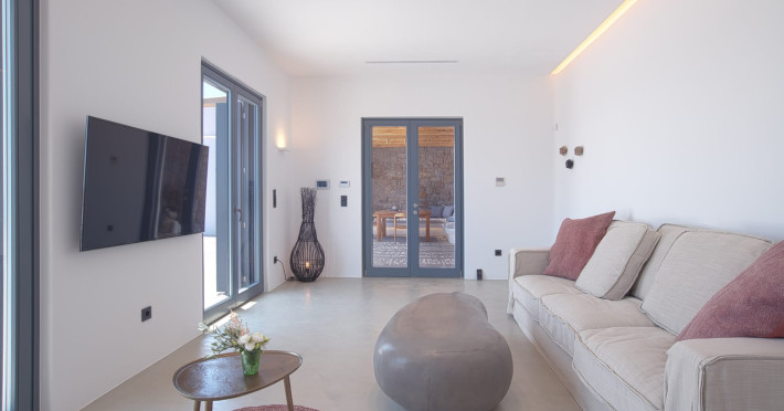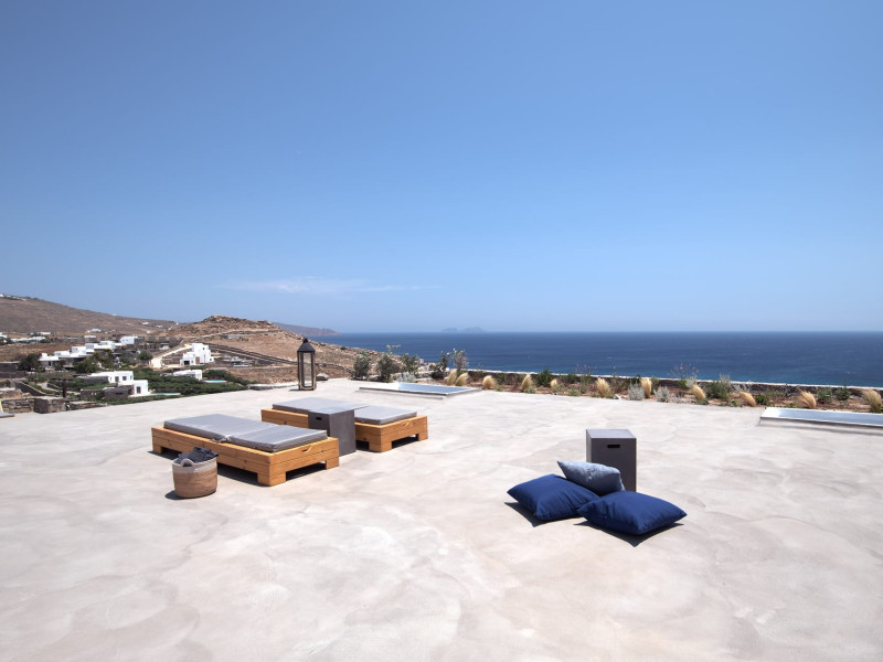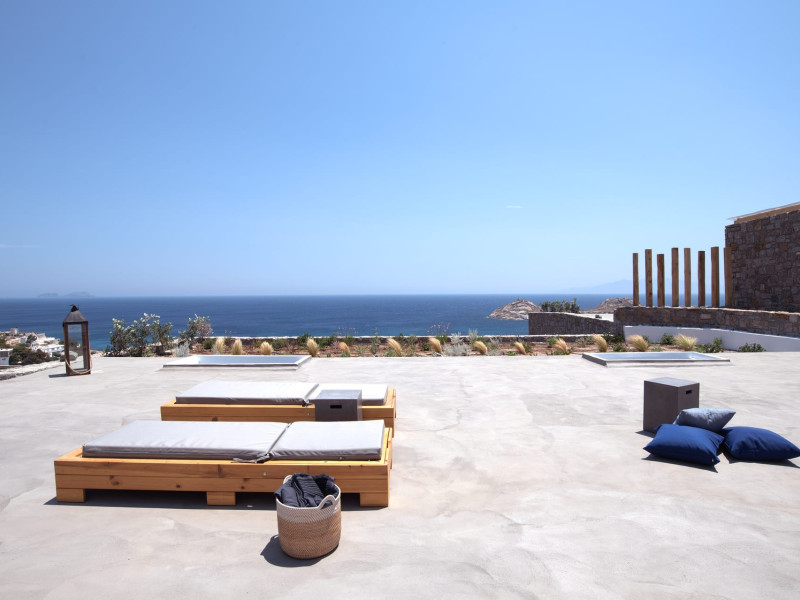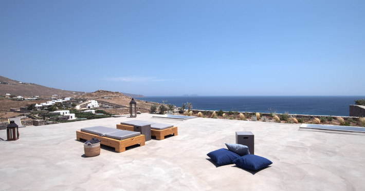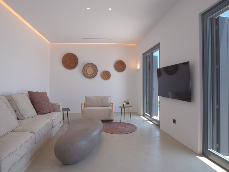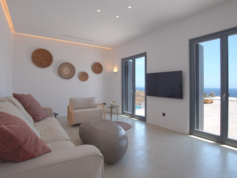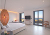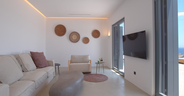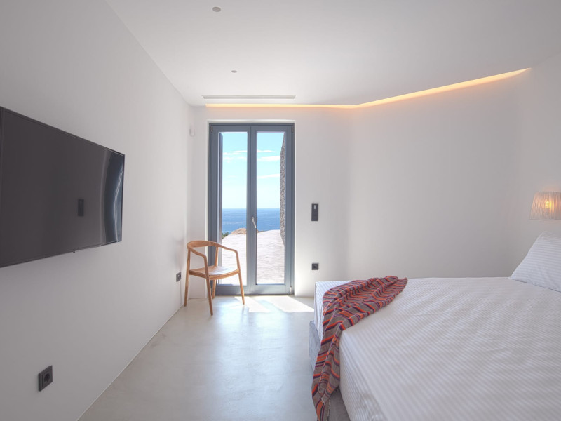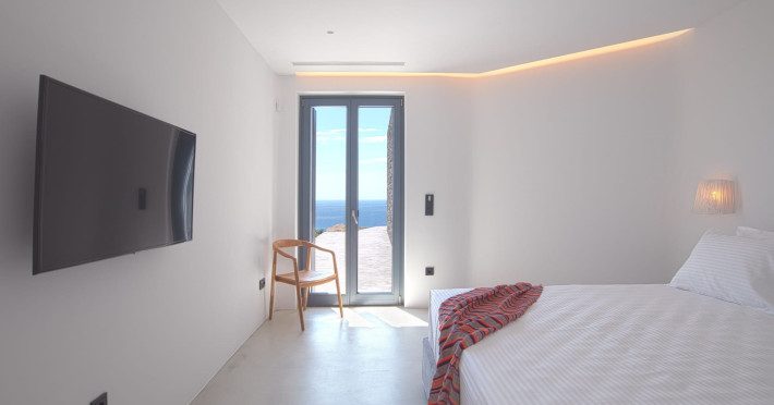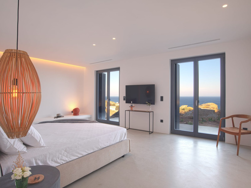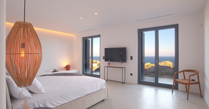 The villa comprises two levels that open to a generous outdoor space with endless sea views. The ground level features a fully equipped kitchen, a cozy living room which connects to the outdoor pool area, and a guest WC. A staircase leads to three different sized bedrooms that occupy the lower level, all with double size beds, private bathrooms and equipped with glass doors that open to the terrace.