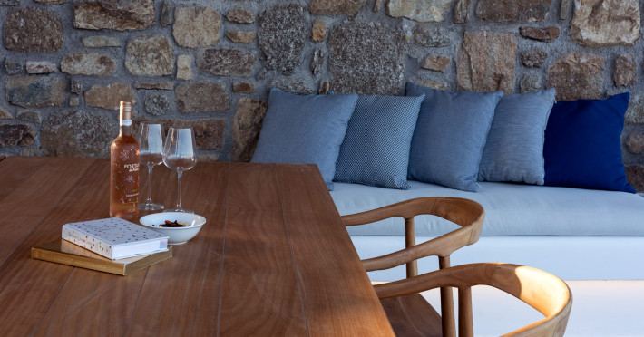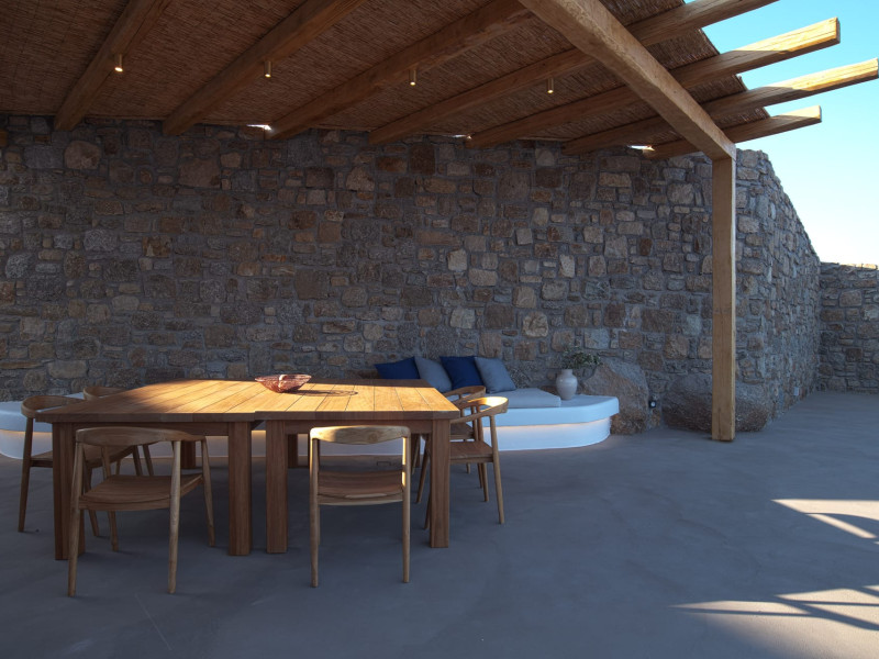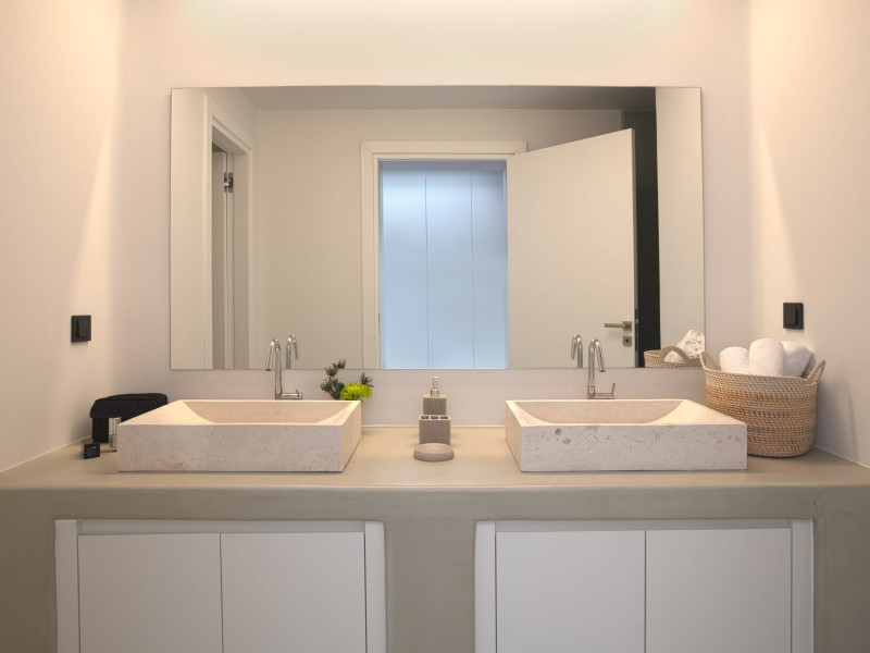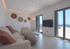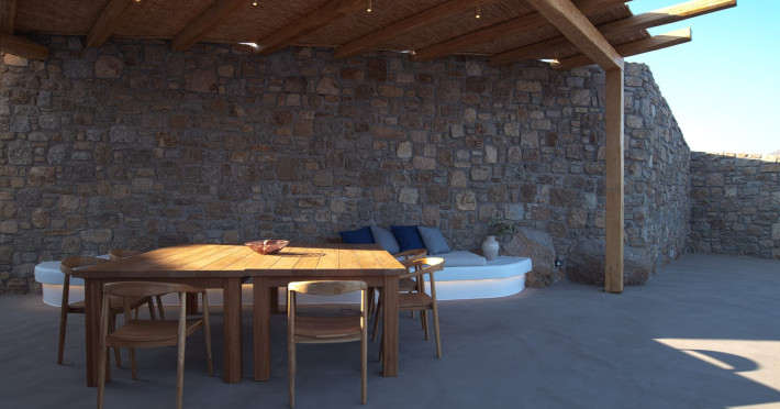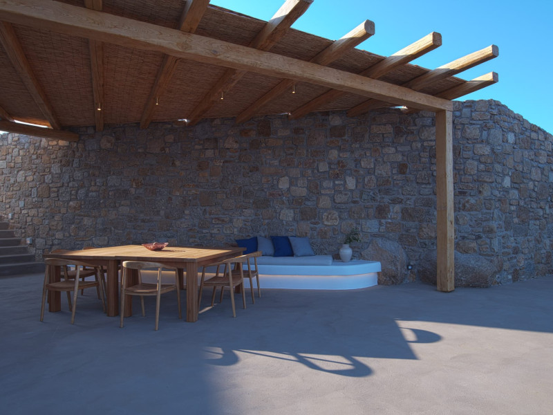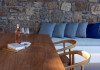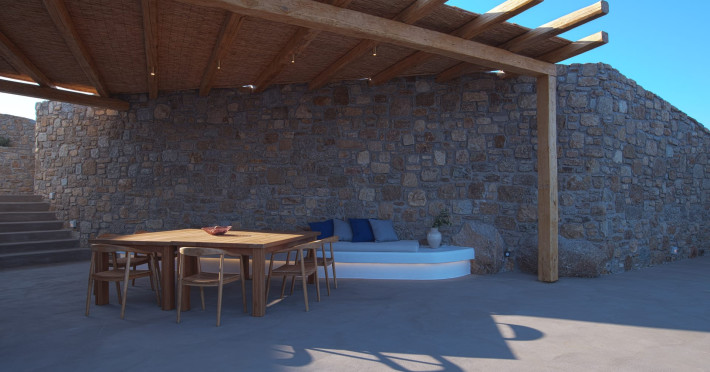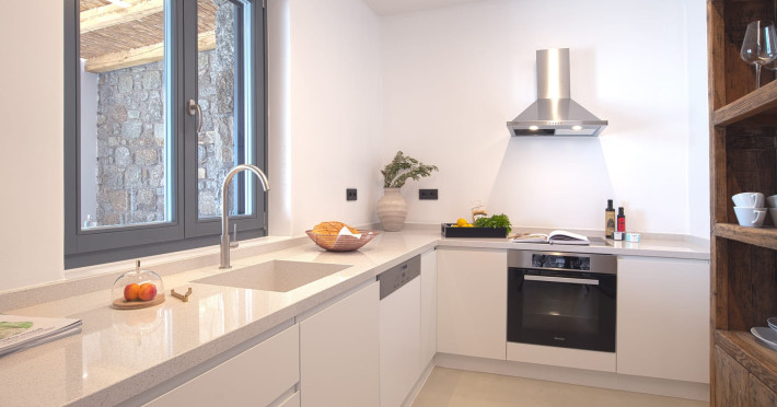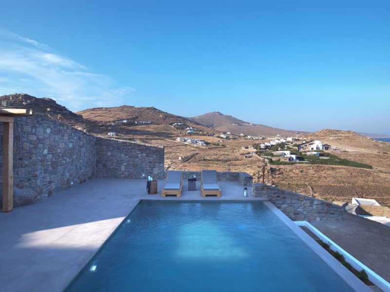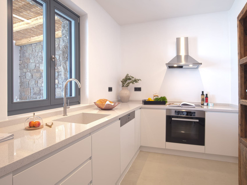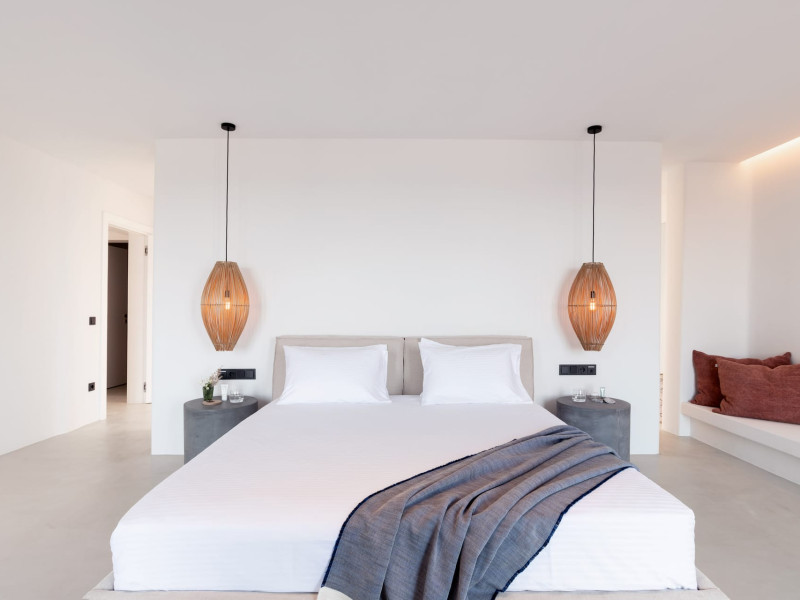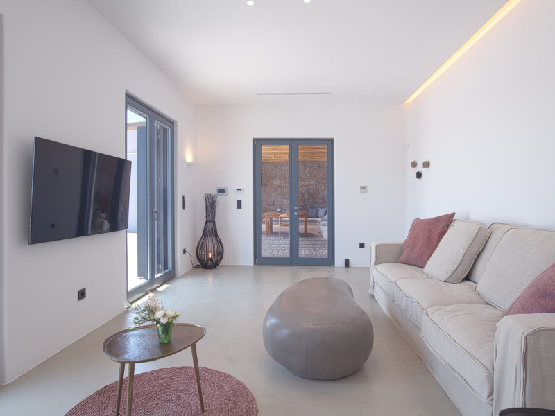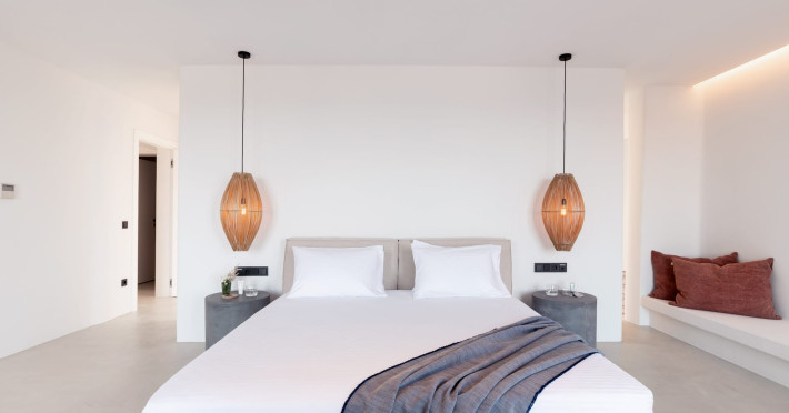 The villa comprises two levels that open to a generous outdoor space with endless sea views. The ground level features a fully equipped kitchen, a cozy living room which connects to the outdoor pool area, and a guest WC. A staircase leads to three different sized bedrooms that occupy the lower level, all with double size beds, private bathrooms and equipped with glass doors that open to the terrace.