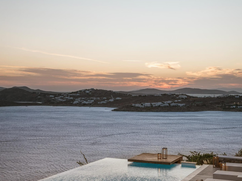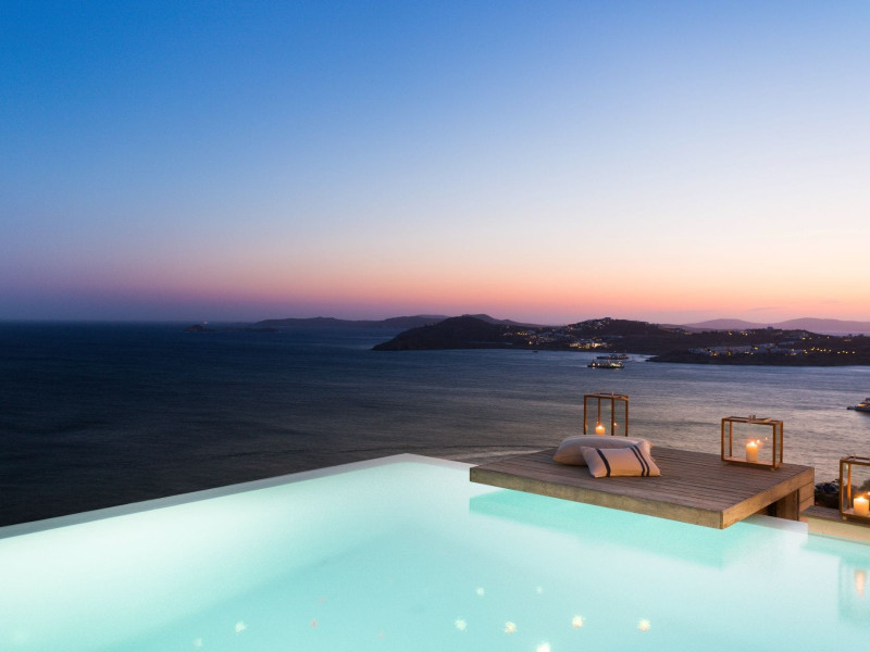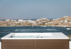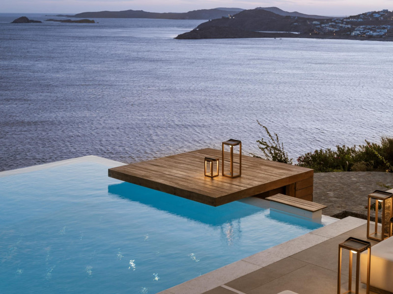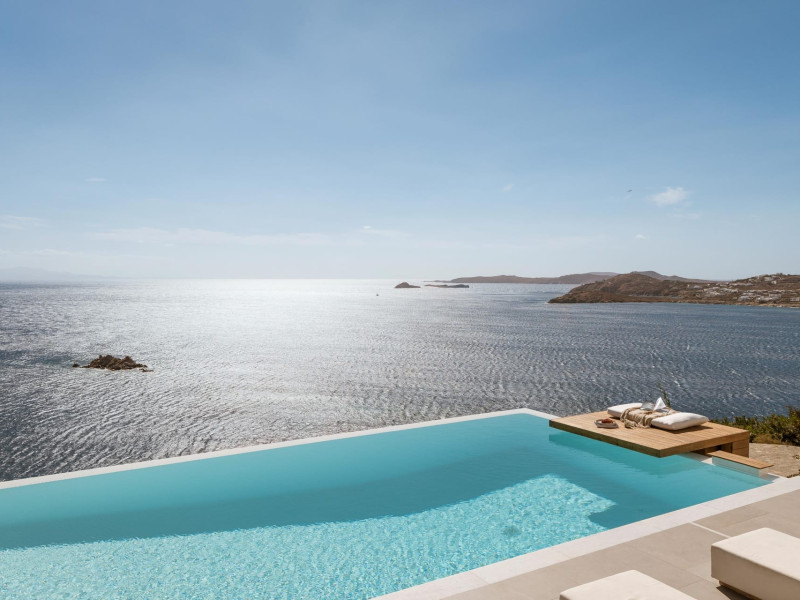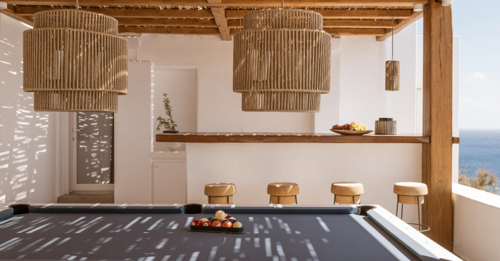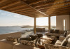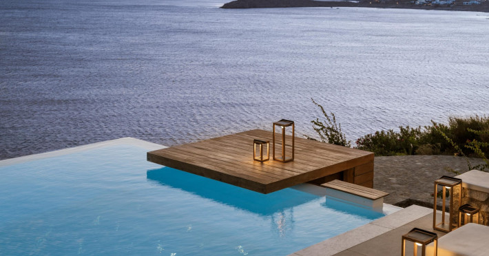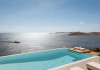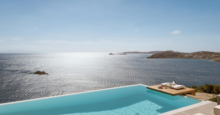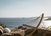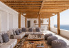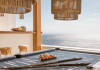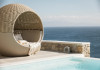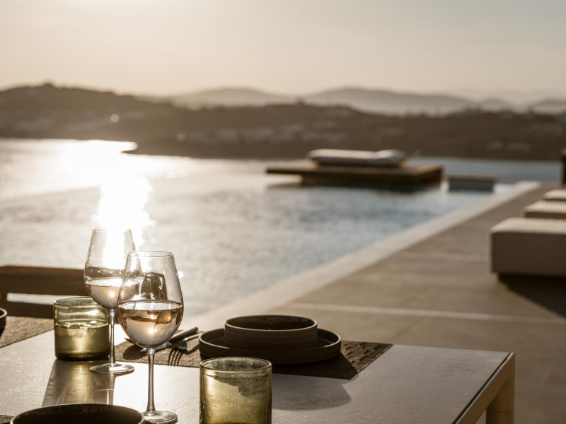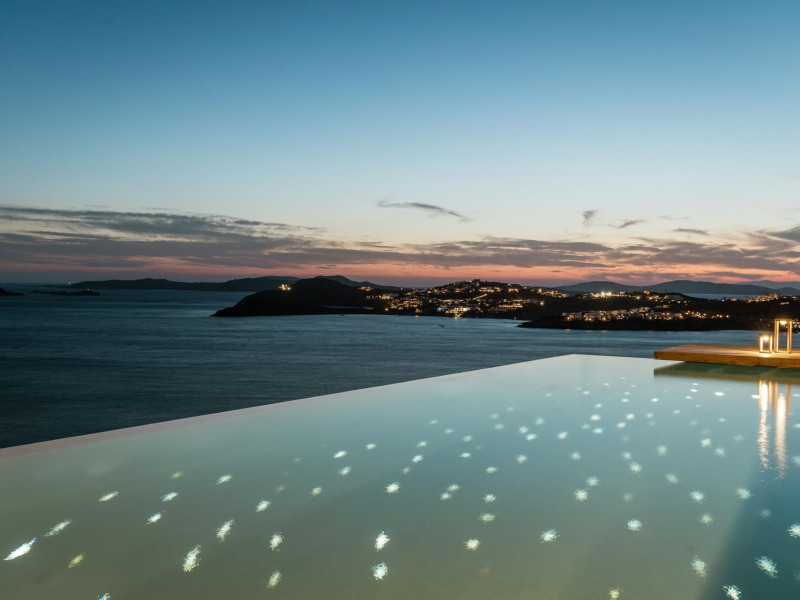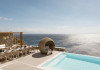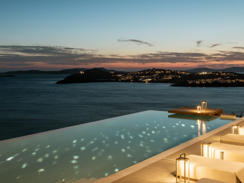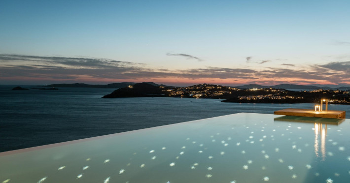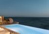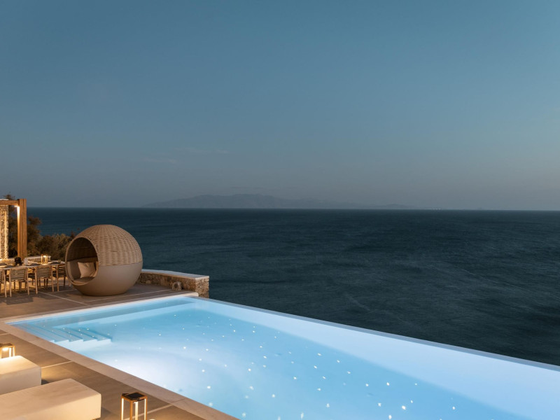 private terrace, and the stylish hand crafted furniture complete the utopian hideaway. In the large outdoor area, stars sparkle from the bottom of the refreshing private infinity pool, while in the clear sky the moon lights the iridescent nights. The unique location of the villa provides perfect shelter from the famous Mykonian winds, as well.