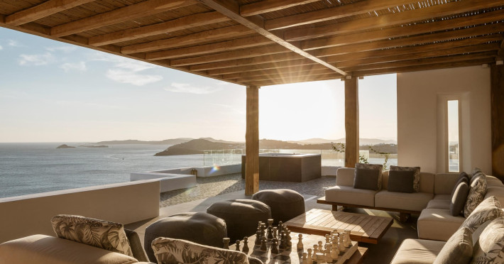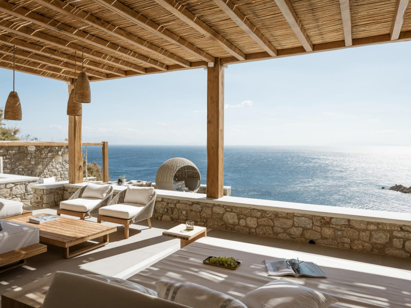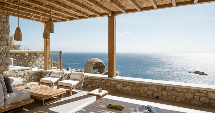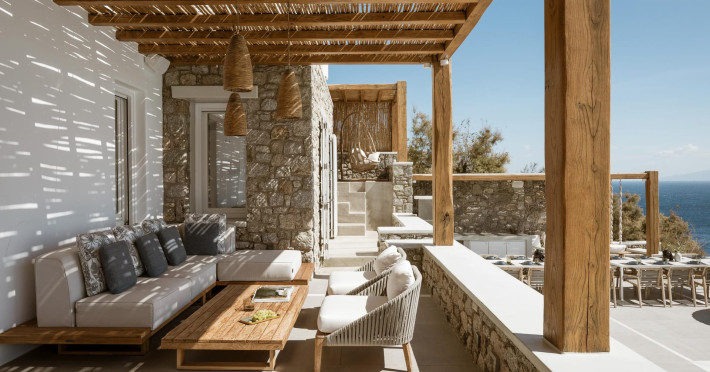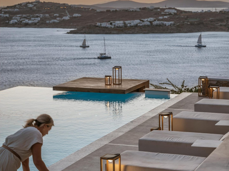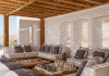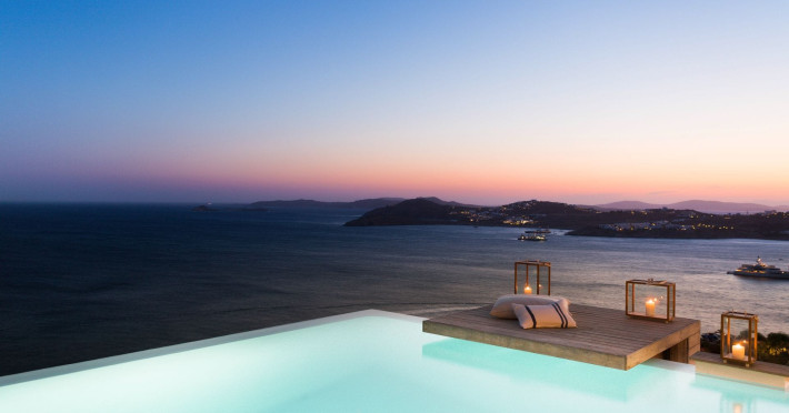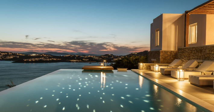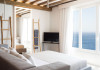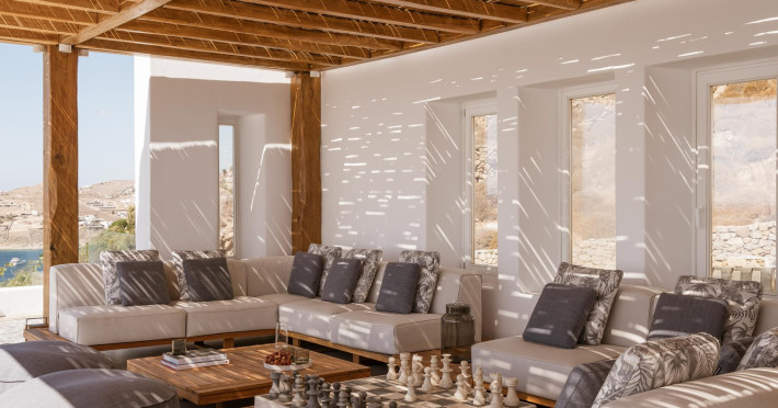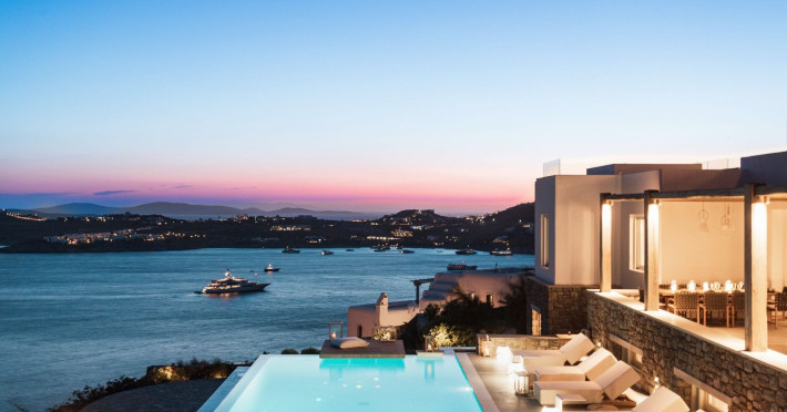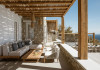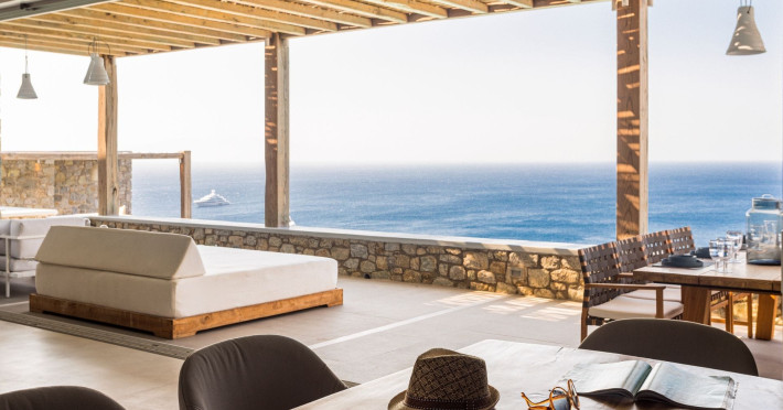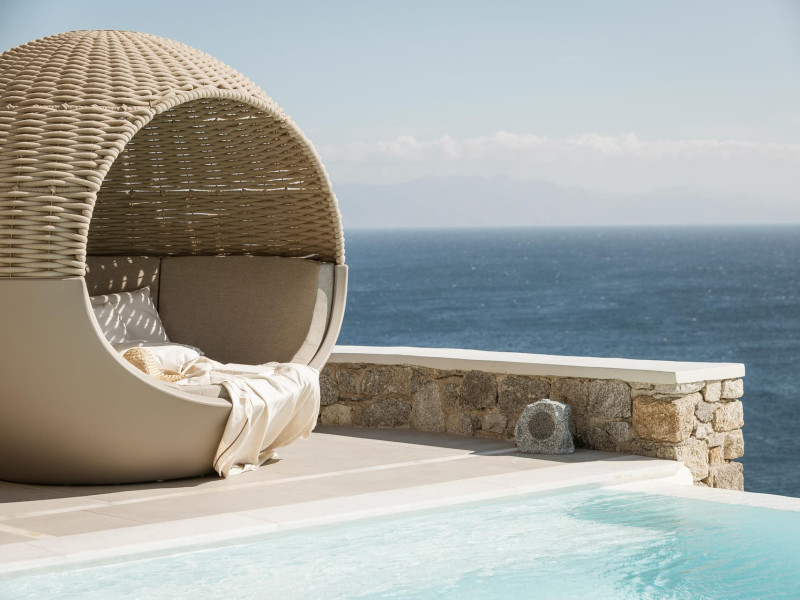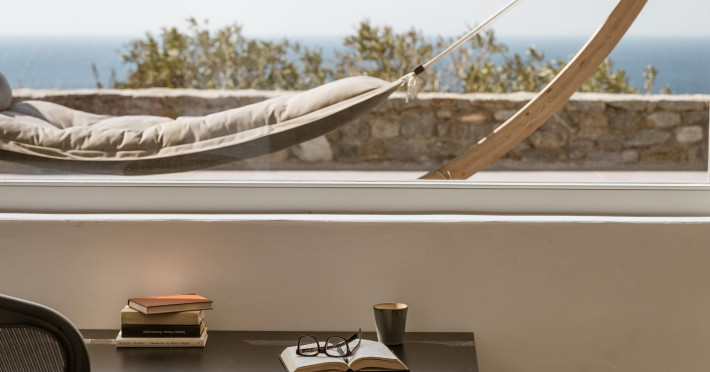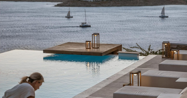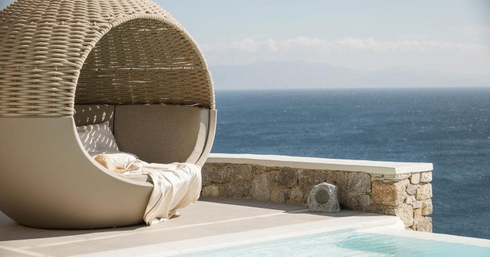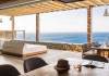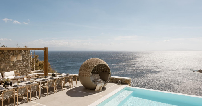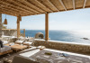 private terrace, and the stylish hand crafted furniture complete the utopian hideaway. In the large outdoor area, stars sparkle from the bottom of the refreshing private infinity pool, while in the clear sky the moon lights the iridescent nights. The unique location of the villa provides perfect shelter from the famous Mykonian winds, as well.