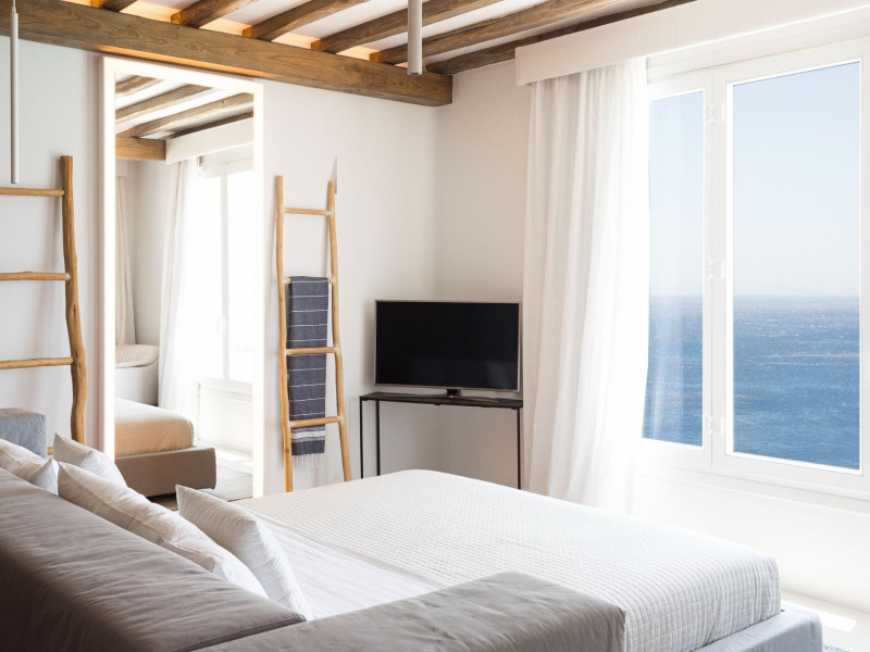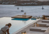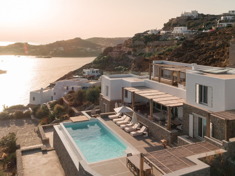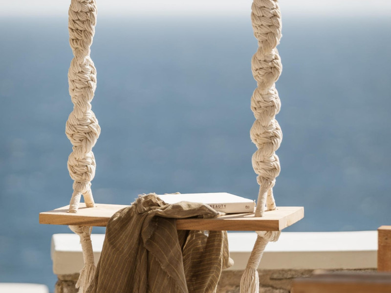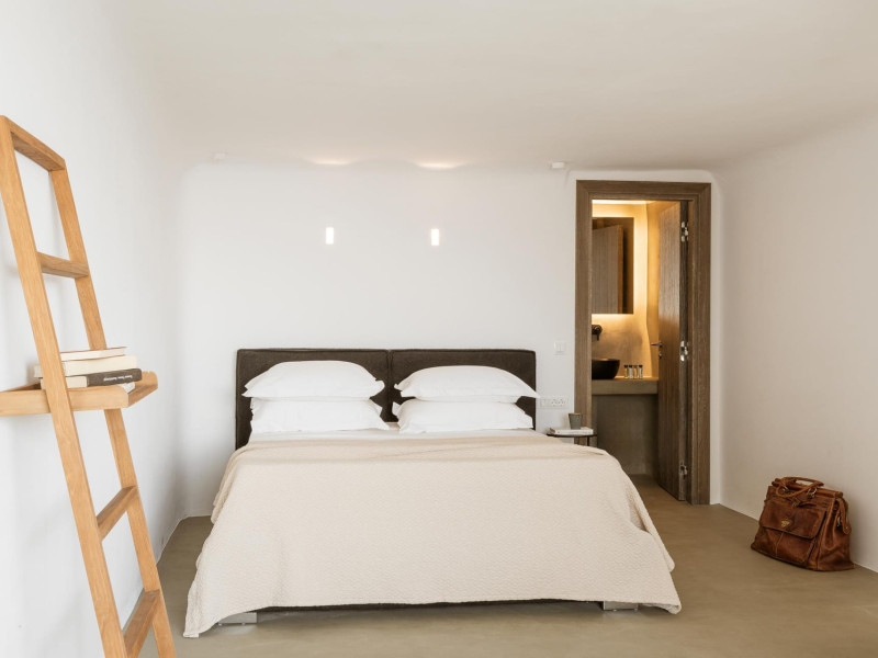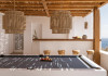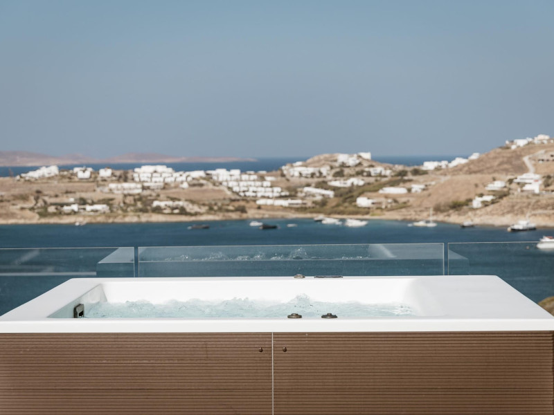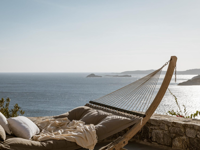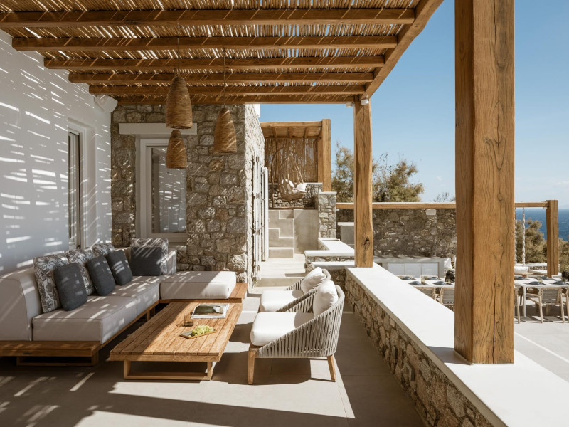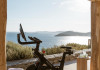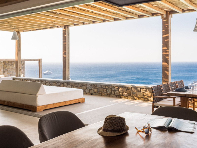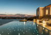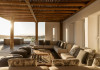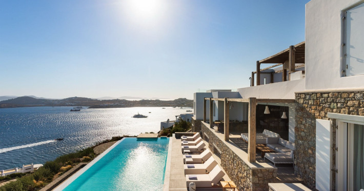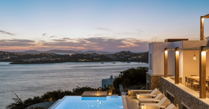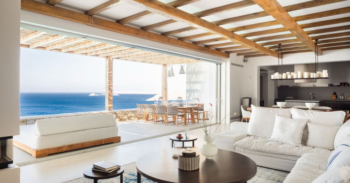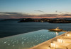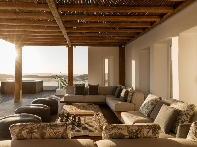 private terrace, and the stylish hand crafted furniture complete the utopian hideaway. In the large outdoor area, stars sparkle from the bottom of the refreshing private infinity pool, while in the clear sky the moon lights the iridescent nights. The unique location of the villa provides perfect shelter from the famous Mykonian winds, as well.