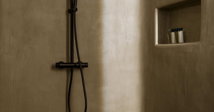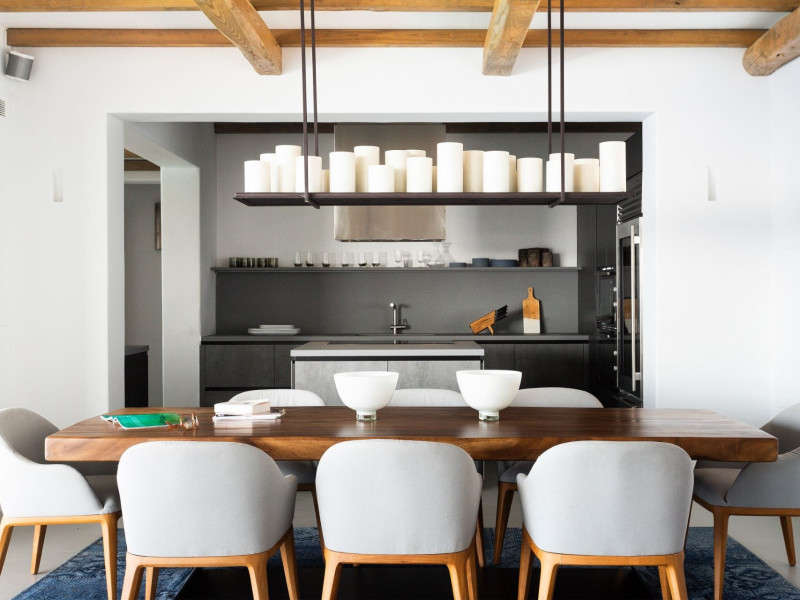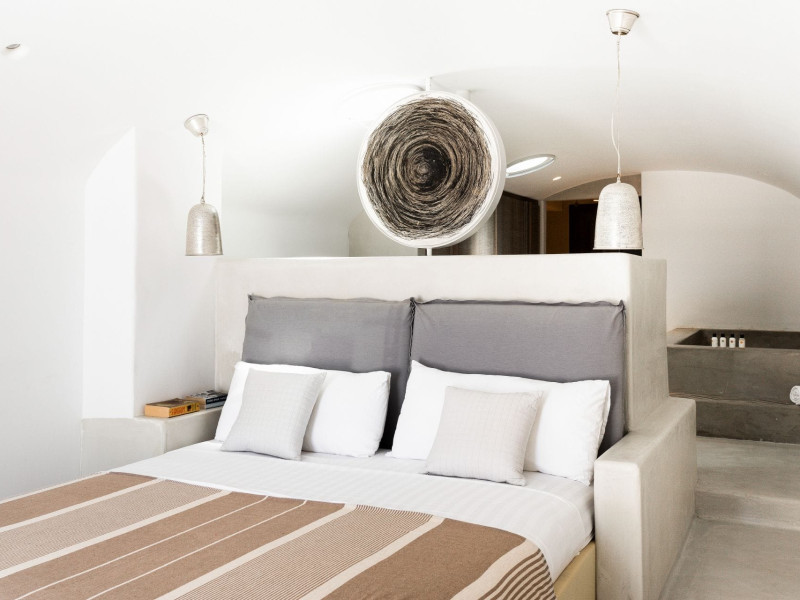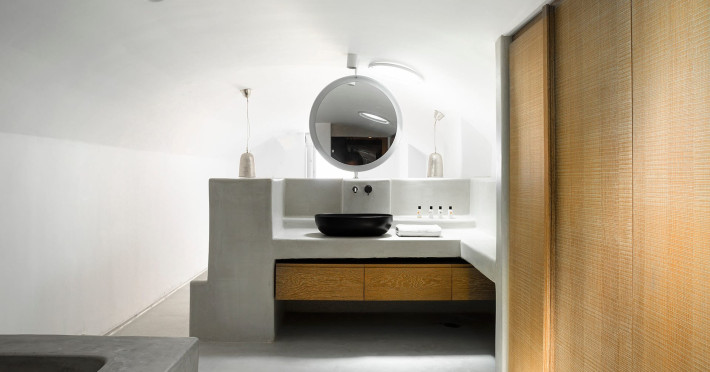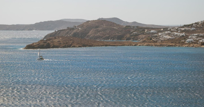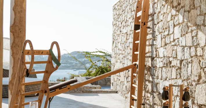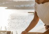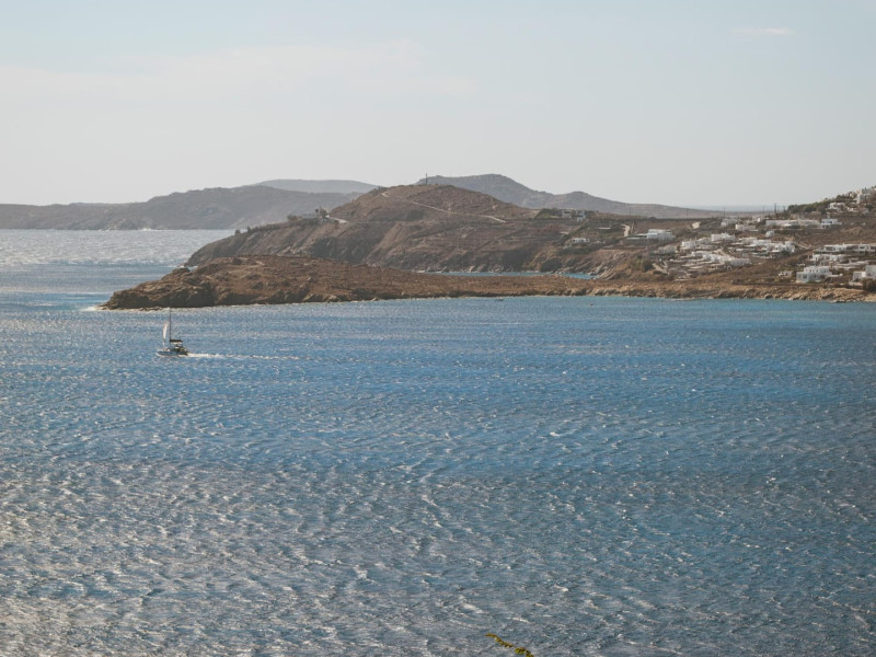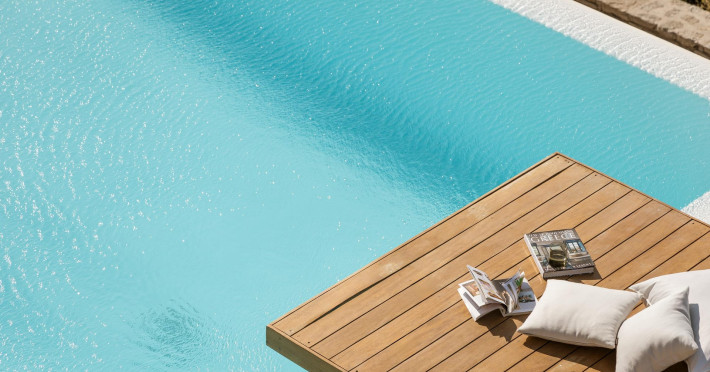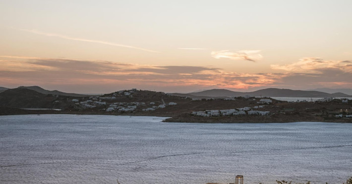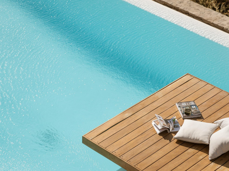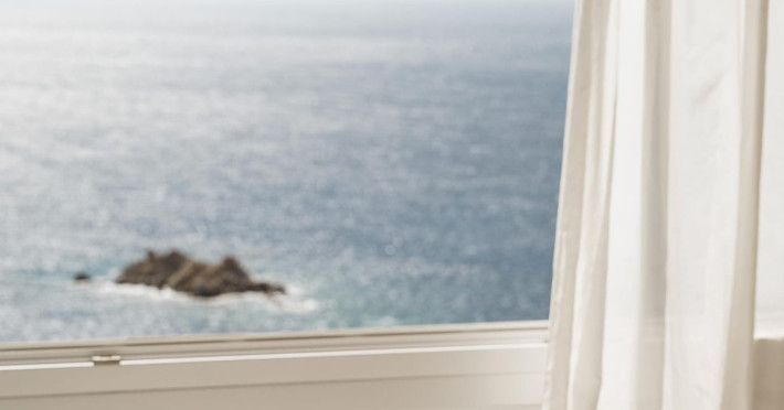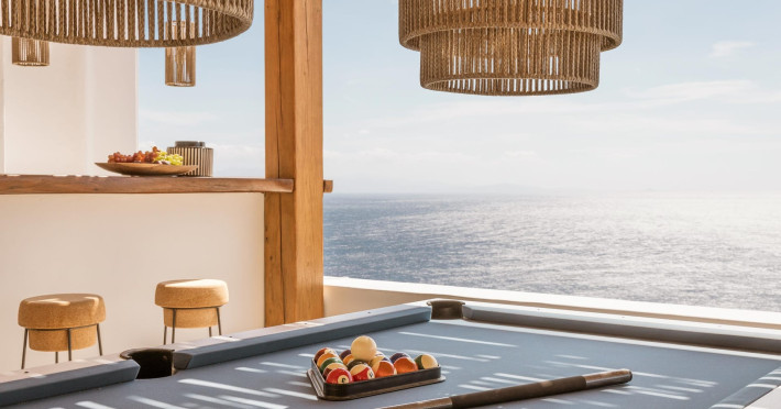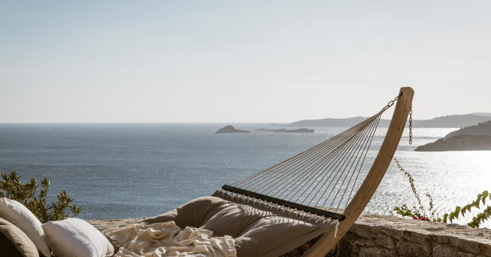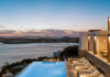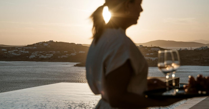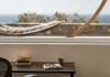 private terrace, and the stylish hand crafted furniture complete the utopian hideaway. In the large outdoor area, stars sparkle from the bottom of the refreshing private infinity pool, while in the clear sky the moon lights the iridescent nights. The unique location of the villa provides perfect shelter from the famous Mykonian winds, as well.