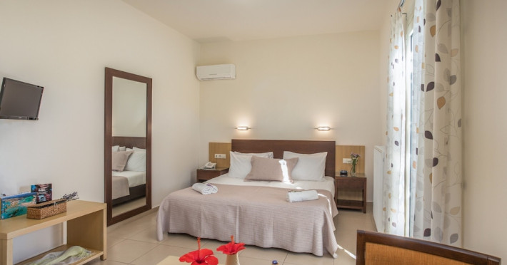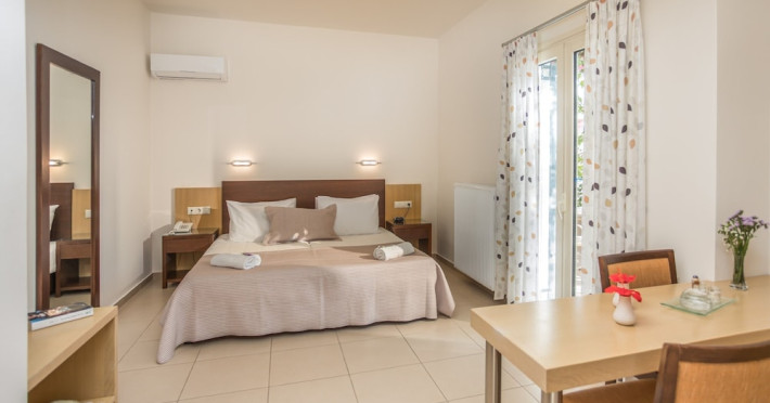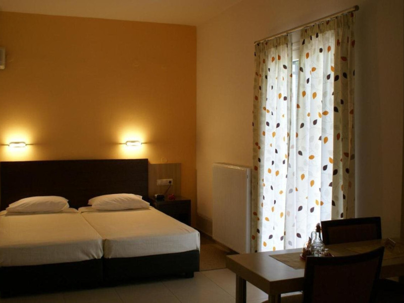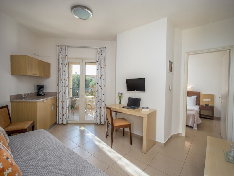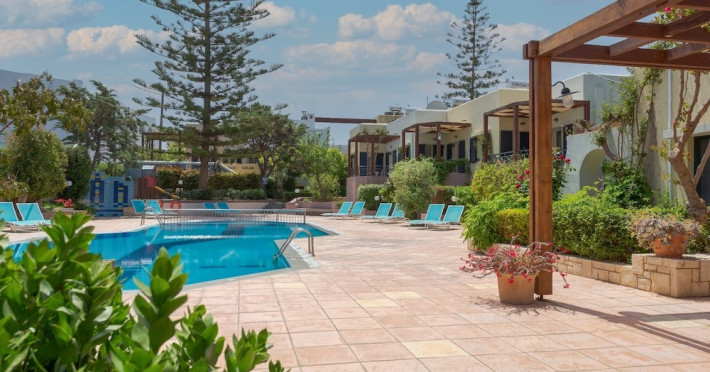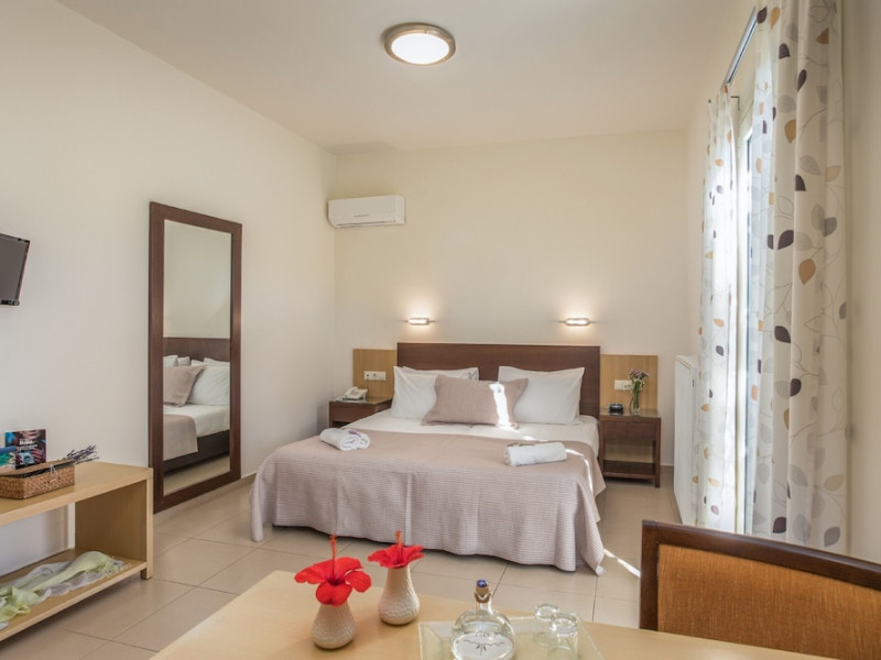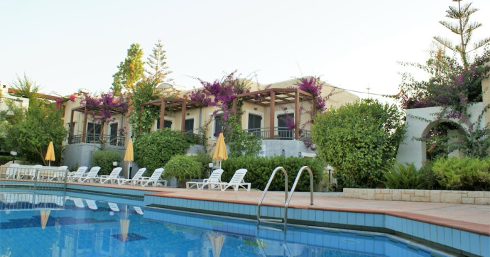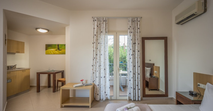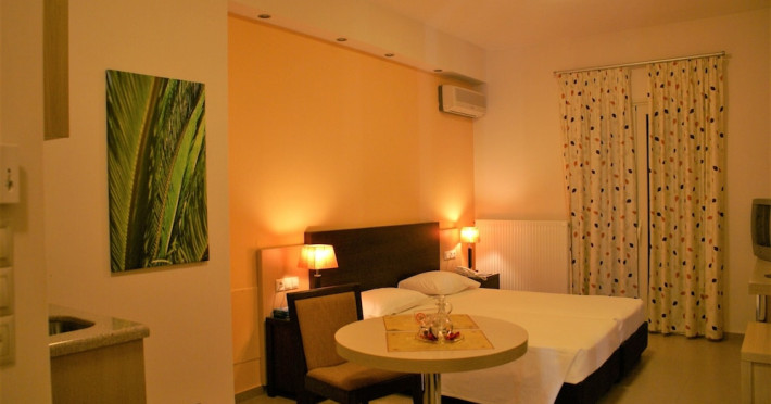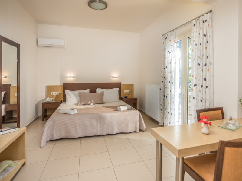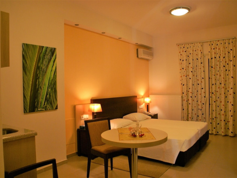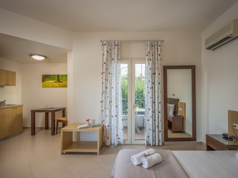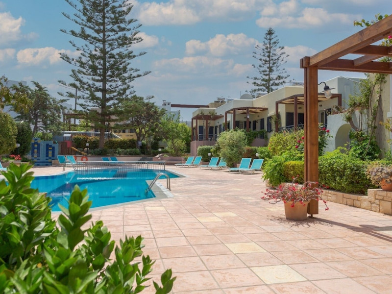 Hotel amenities include reception, TV room, internet corner, swimming pool, bar, restaurant and parking. All studios and apartments are equipped with A/C , safe, kitchenette with mini fridge, kettle and coffee maker, telephone, TV, WIFI and balcony or terrace.Address: Kato Gouves Pediados, 70014 Heraklion, Crete, Greece