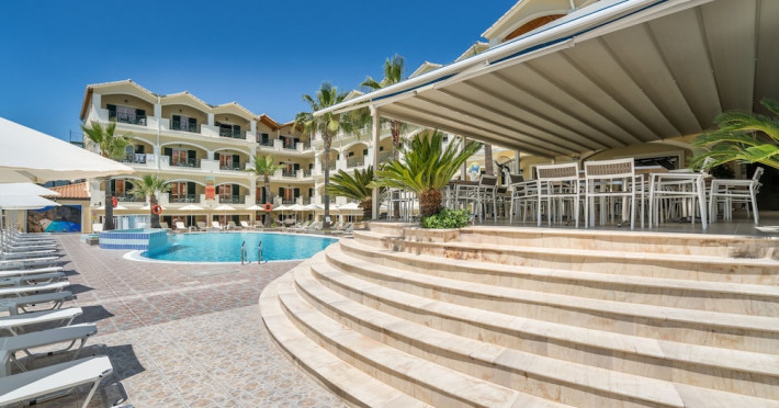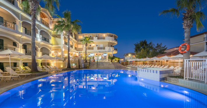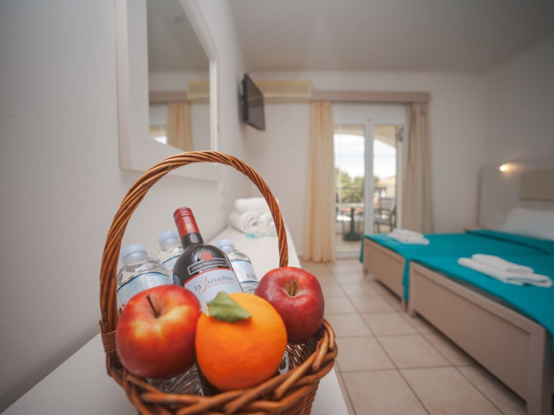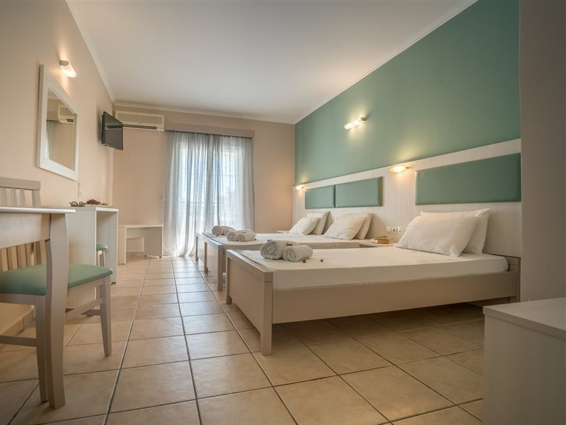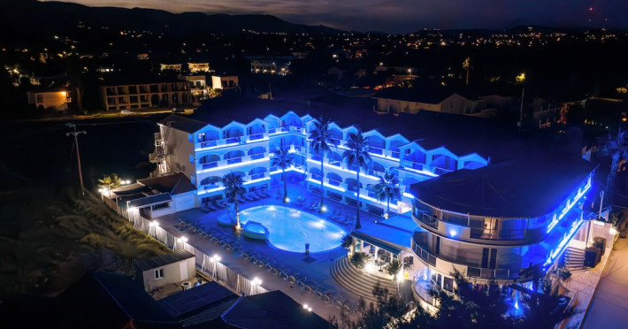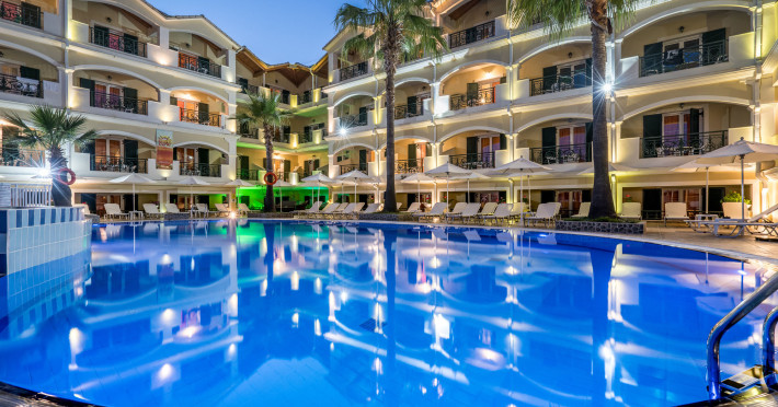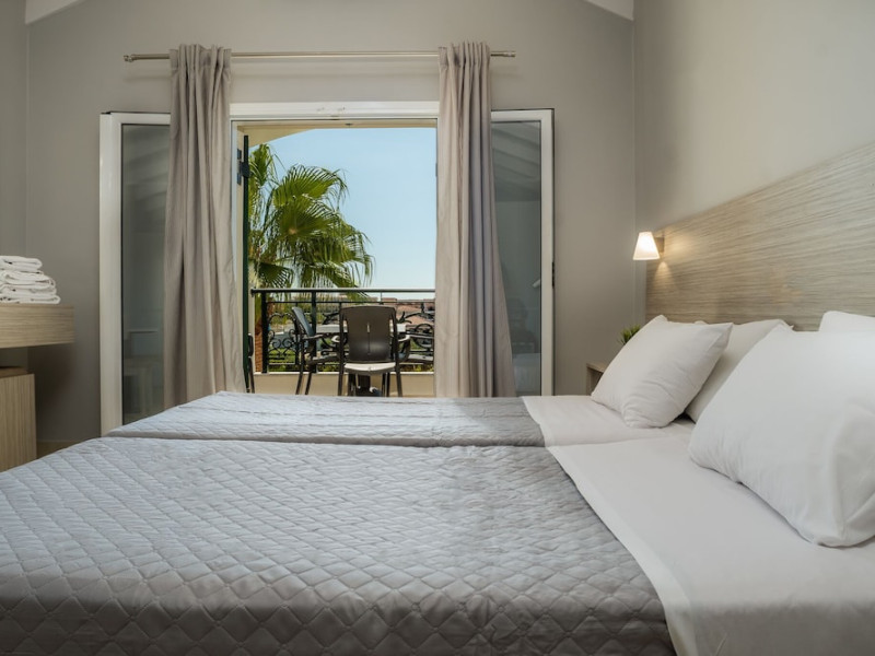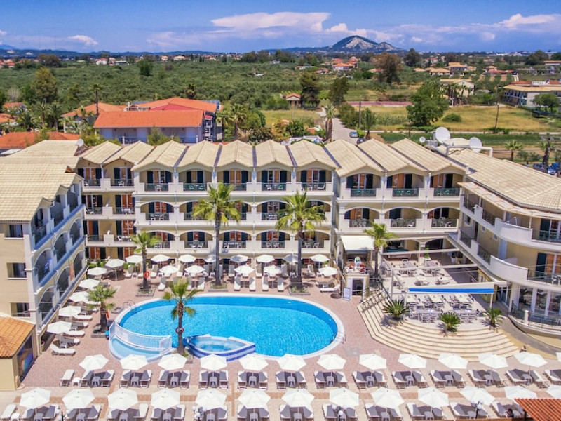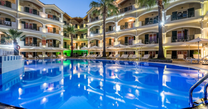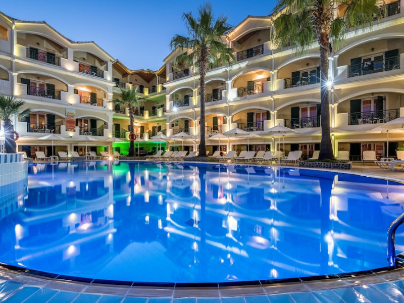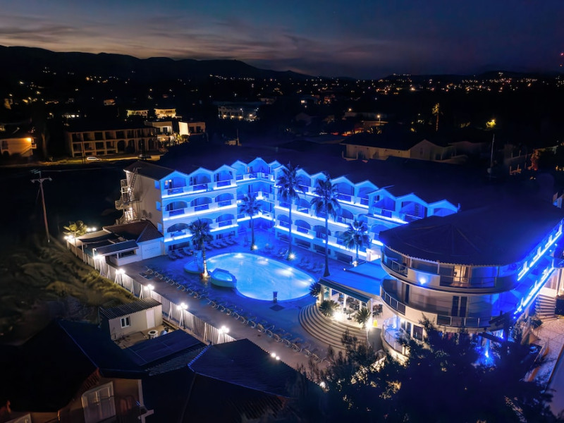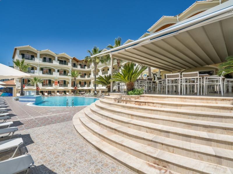Hotel facilities and services include air conditioning, wireless internet access, car parking, restaurant, bar, swimming pool, elevator and room service (limited hours). Room facilities such as air conditioning, wireless internet access, cable/satellite TV, safe, fridge, coffee/tea maker, telephone and a bathroom with hairdryer. Address: Laganas, Zakynthos, 29092, Greece.