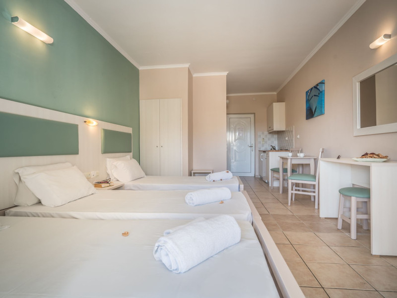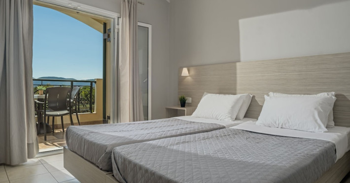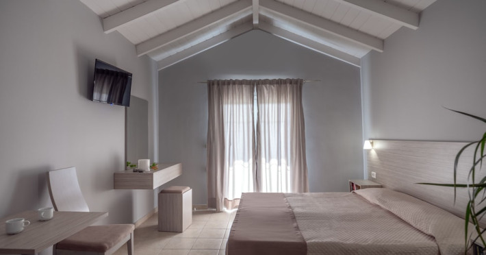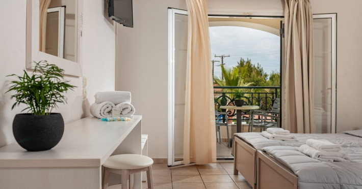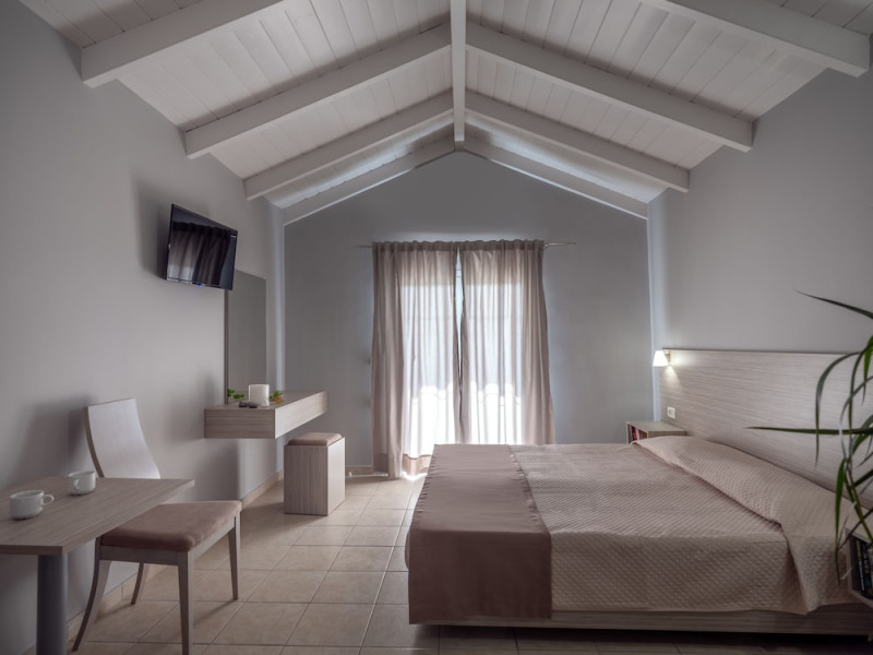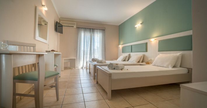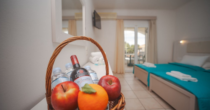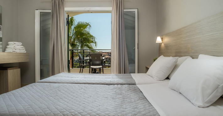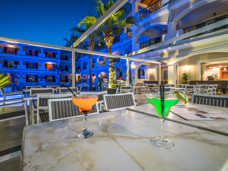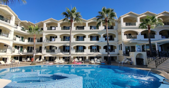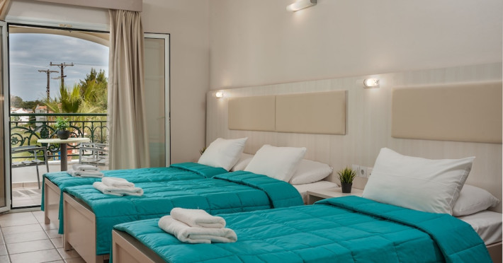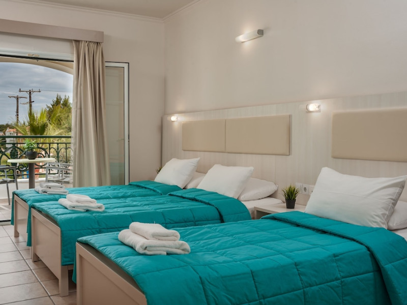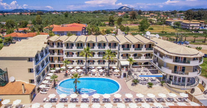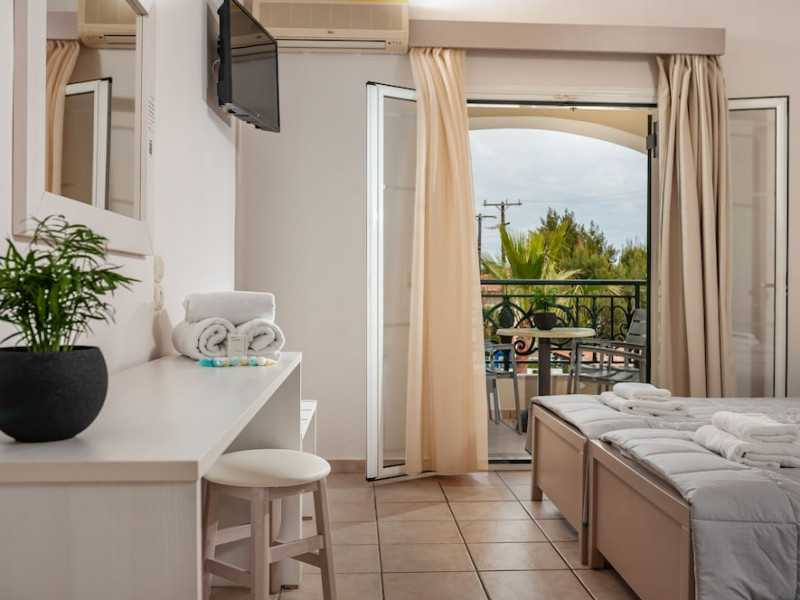 Hotel facilities and services include air conditioning, wireless internet access, car parking, restaurant, bar, swimming pool, elevator and room service (limited hours). Room facilities such as air conditioning, wireless internet access, cable/satellite TV, safe, fridge, coffee/tea maker, telephone and a bathroom with hairdryer. Address: Laganas, Zakynthos, 29092, Greece.